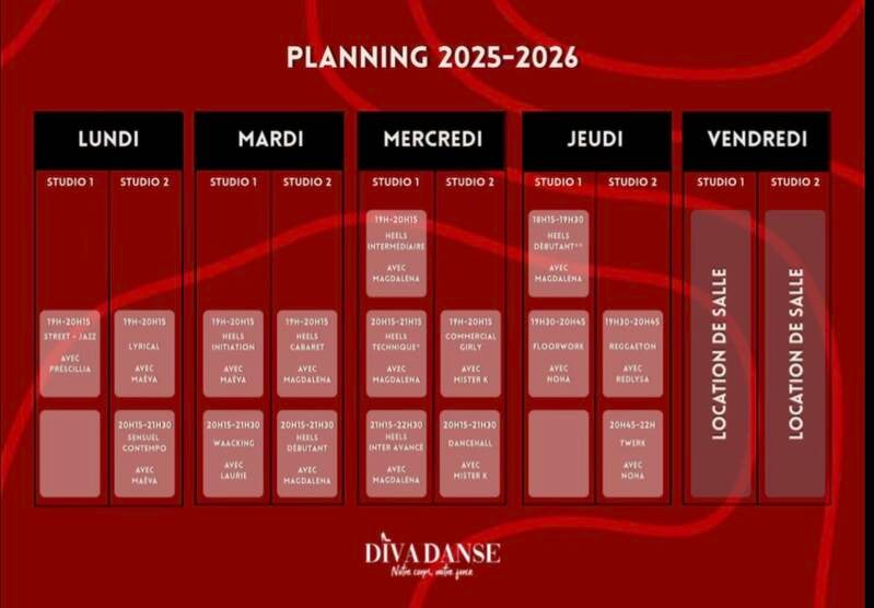 Planning des cours à l'école Diva danse